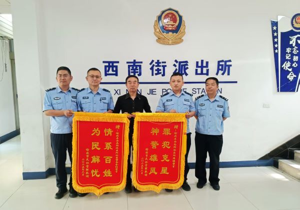 圖為市民杜寶勝向西南街派出所贈送錦旗時的場景